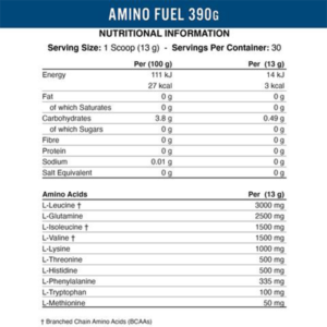 Amino Fuel is the perfect blend delivering 11g of Aminos per serving, 9g of which are Essential Amino Acids (EAA) including 6g of Branched Chain Amino Acids (BCAAs) at a 2:1:1 ratio (3000mg L-Leucine, 1500mg L-Isoleucine, 1500mg L-Valine) with an additional 2g of L-Glutamine.