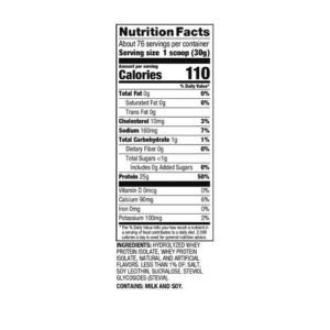 Other Ingredients: Hydrolyzed Whey Protein Isolate, Whey Protein Isolate, Cocoa (processed with alkali), Natural & Artificial Flavors, Salt, Soy Lecithin, Sucralose, Steviol Glycosides (Stevia Leaf Extract).