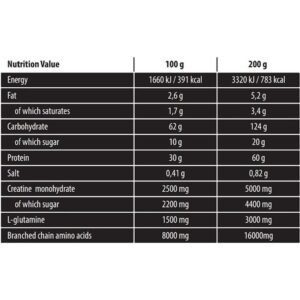 Food supplement. With sweetener. New generation gainer. Mass gainer powder for preparing a nutritional protein and carbohydrate drink enriched with creatine and L-glutamine. Designed for adults performing high intensity excercise. Protein contributes to the growth and maintenance of muscle mass. Creatine increases physical performance in successive bursts of short-term, high intensity exercise, beneficial effect is obtained with a daily intake of 3 g of creatine.